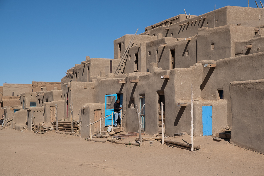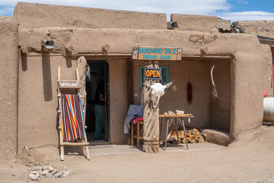 Nicht weit von Taos steuern wir gleich früh morgens das Taos Pueblo an. Das Dorf wurde bereits um 1000 n.Chr. gegründet und gehört damit zu den ältesten ständig bewohnten Siedlungen der USA. Die Häuser bestehen aus einem Gemisch aus Stroh, Lehm und Wasser, deshalb muss ständig etwas repariert werden, besonders nach heftigen Regenfällen. Ganz alleine können wir das Ensemble besichtigen, allerdings ist nur ein Teil für Touristen zugänglich, schließlich leben hier noch etwa 1000 Pueblo-Indianer. Die Vorderansicht wurde entsprechend aufgehübscht, doch schaut man etwas um die Ecke, sieht das alles nicht mehr ganz so toll aus.