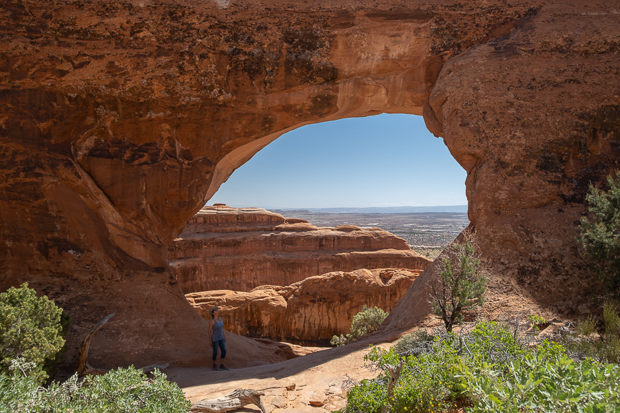 Am nächsten Tag fahren wir mit unseren E-Bikes zur Windows Section. Dort gibt es eine ganze Ansammlung verschiedenster Felsbögen, zum Beispiel einen Doppelarch und die Windows, zwei nebeneinander liegende Felsbögen, die auch etwas Ähnlichkeit mit einer überdimensionierten Brille haben. Mit den Rädern zu fahren, war eine gute Idee, denn selbst am frühen Morgen sind alle Parkplätze belegt. Die Menschenmassen bewegen sich zum Glück nur auf den befestigten Wegen zu den Highlights, sobald wir etwas abseits gehen, sind wir (fast) alleine. Diese Erfahrung machen wir fast überall, sogar im Grand Canyon NP.