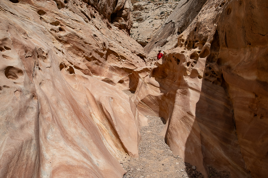 Wir verlassen gleich morgens den Platz am Shafer Trail, erledigen noch einige Einkäufe im City Market in Moab und starten dann durch über die I-70 und die #24 bis zum Little Wild Horse Canyon. Der beeindruckt weniger durch steile, hohe Wände, sondern durch seine Löcher, Rinnen und besonders geschwungenen Formen. Ein leicht erreichbarer und auch leicht begehbarer Canyon, auch für Kinder geeignet.