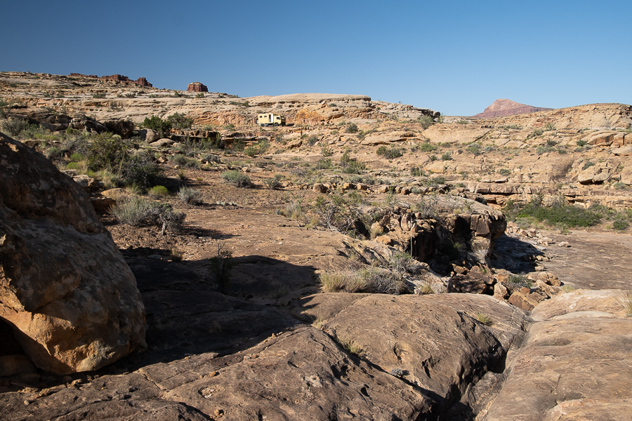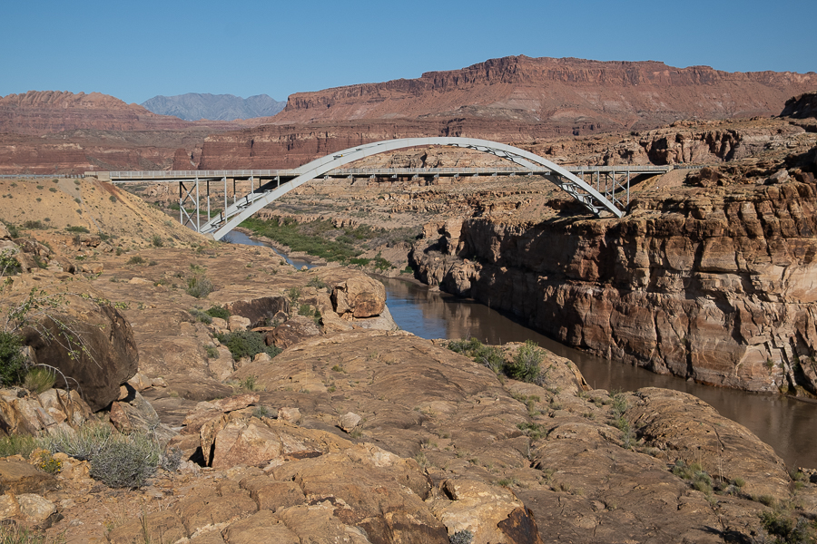 Es wird also nichts mit dem netten Platz am Colorado, denn der fließt viel zu weit unten und da kommen wir nicht hin. Wir finden trotzdem einen schönen Übernachtungsplatz mit Blick auf die Hite Crossing Bridge.
