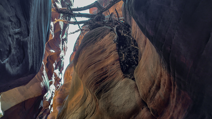 Am nächsten Tag scheint wieder die Sonne und wir erkundigen uns in der Paria Cantact Station, ob der Buckskin Gulch gefahrlos erwandert werden kann. Der Buckskin ist eine der tiefsten und längsten Slot Canyons der Welt (wenn nicht sogar der tiefste weltweit) und wie alle Slot Canyons sind hier die Flash Floods, die Sturzfluten, gefürchtet. Auch wenn hier die Sonne scheint, kann es weit weg regnen, das Wasser sammelt sich und rauscht meterhoch durch die Schlucht. Je enger diese ist, desto höher steigt das Wasser. Ein Entkommen ist praktisch unmöglich, weil die Flut sehr schnell kommt und man ja schwerlich die steilen Wände hochkommt. Viele Meter über dem Boden hängendes Gestrüpp und sogar verkeilte Baumstämme sind die Hinterlassenschaften solcher Fluten.