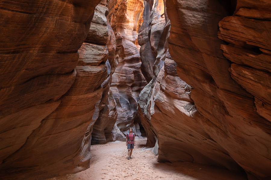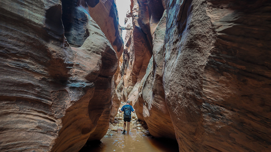 Der Ranger gibt aber sein OK und wir fahren die House Rock Valley Road bis zum Wire Pass Trailhead, wo der Weg zum Buckskin Gulch sowie zur berühmten "Wave" (Coyote Buttes North) startet. Es geht ein ganzes Stück durch einen Wash, ein breites Flussbett und dann steht man plötzlich vor der Engstelle, wo es etwa 5 Meter tiefer weitergeht. Zum Glück steht hier eine Leiter und das Abenteuer kann beginnen. Der Canyon ist absolut spektakulär und eigentlich keine große Herausforderung, wären da nicht die teils tiefen mit Wasser gefüllten Stellen. Also Schuhe und Strümpfe aus, an wieder aus , an....manchmal zogen wir sogar die Unterhosen aus. es war ein Heidenspaß und sooo schön.