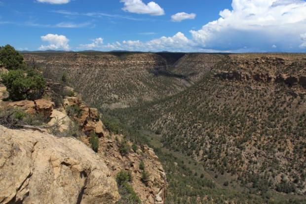 Nach dem Frühstück sind wir dann zum Parkplatz der „Balkony Tour“ so ziemlich am Ende der Parkstraße gefahren. Die Fahrt zog sich wegen enger Straße und Geschwindigkeitsbegrenzung etwas in die Länge, also sollte jeder genügend Zeit einplanen, um rechtzeitig zum Start der gebuchten Tour vor Ort zu sein. Die Landschaft im Mesa Verde ist recht interessant uns vor allem grün. Zu Beginn führt die Straße in Serpentinen auf 2500m bergauf. Auf dem Rückweg sollte man ruhig mal gelassener fahren, da einige Kurven doch recht scharf geschnitten sind. Den Leitplanken würde ich da nicht vertrauen, wenn man doch mal mit dem Womo reindonnert. Wir hatten jedenfalls den nötigen Respekt – und Zeit.