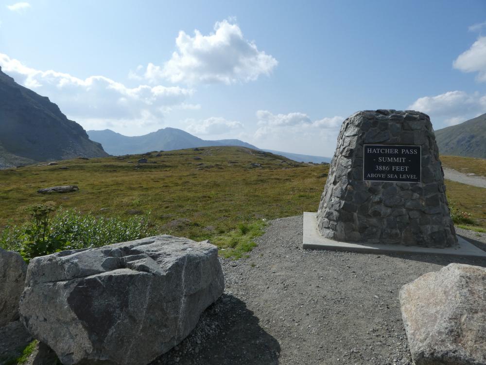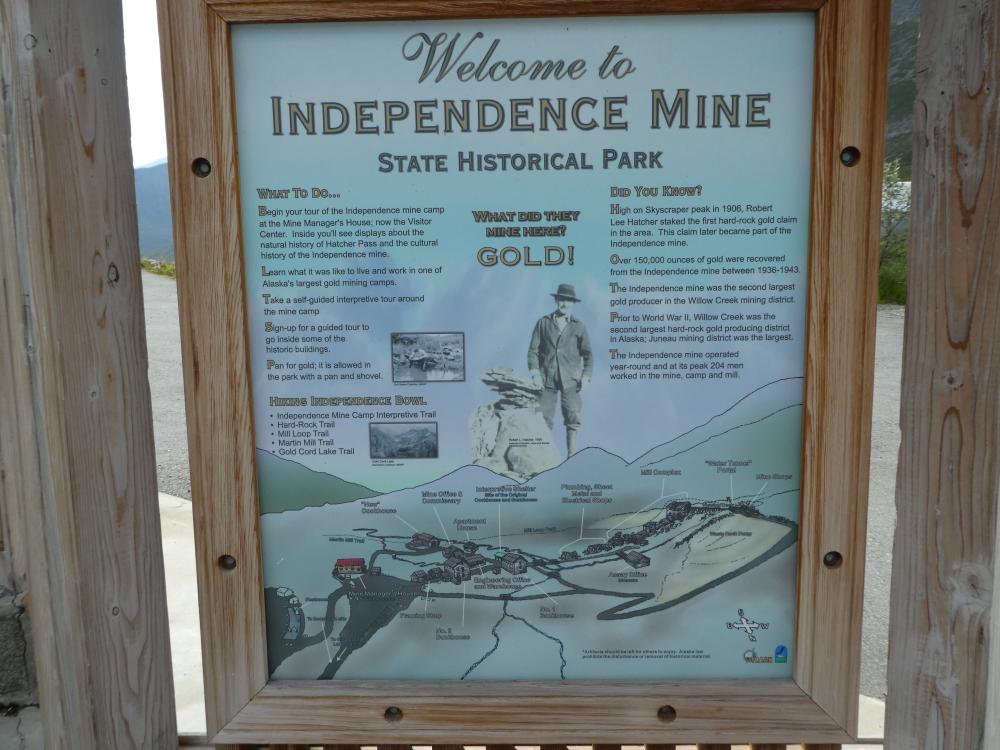 Nach jetlag-bedingtem frühem Erwachen ging es gut ausgeschlafen zum ersten Grosseinkauf bei Walmart ganz in der Nähe. Da war morgens kurz nach 7.00 schon viel Betrieb. Obwohl wir diese stores inzwischen recht gut kennen, dauert es doch jedes mal länger als gedacht, bis alles beisammen ist. Noch ein Frühstück bei McDonalds, dann brachen wir gegen 11.00 auf gen Norden. Entlang des Old Glenn Hwy liessen wir Palmer "links liegen", obwohl da gerade der grosse, alljährliche farmers market stattfand (interessant, aber benötigt Zeit). Die langsam ansteigende Hatcher Pass Road führte uns in das malerische Hochtal, in dem die Independence Mine gelegen ist.