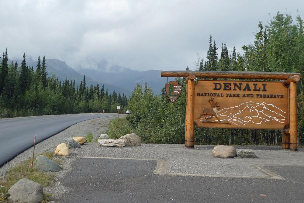Am nächsten Morgen ging es nach dem Tanken weiter in den Norden, bei nun zunehmend bewölktem Himmel. Leider waren so kaum Berge und kein Denali zu sehen. Wir machten Pausen beim Alaska Veteran's Memorial, an verschiedenen viewpoints und beim herbstlichen Broad Pass, mit seinen wie in die Tundra hinein getupften Fichten. Am Nachmittag erreichten wir den Denali NP, nun bereits im Regen.