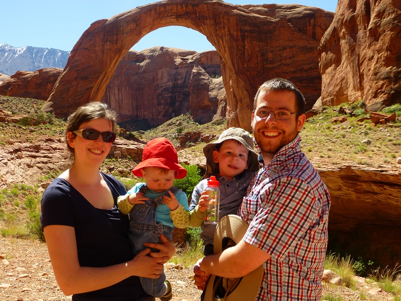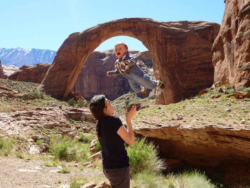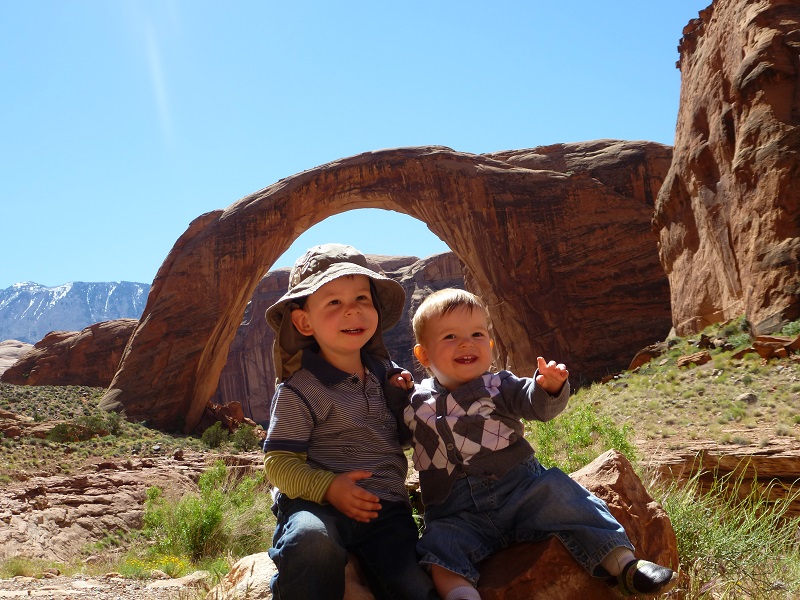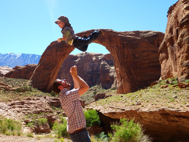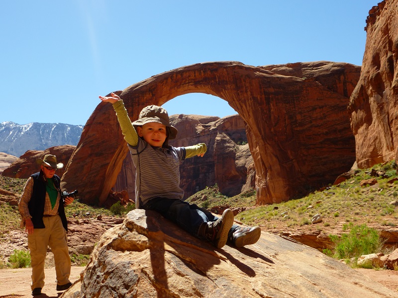 Jetzt ist es noch eine Meile Fußweg, die uns von der Rainbowbridge trennt. Die Kids kommen beide auf unsern Rücken, damit wir mit der Gruppe Schritt halten können. Nach ein weinig Kraxelei kommen wir bei der Brücke an.