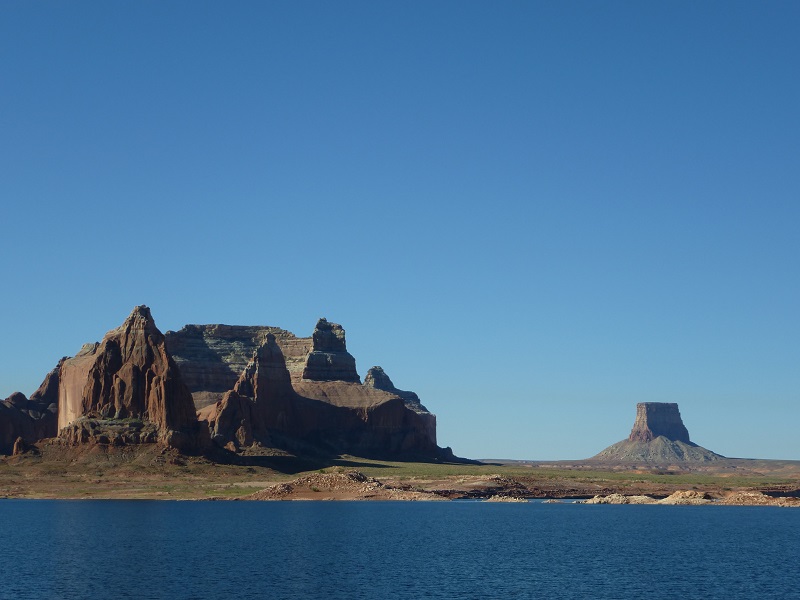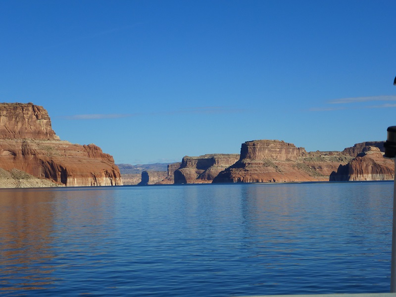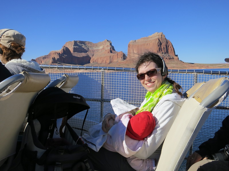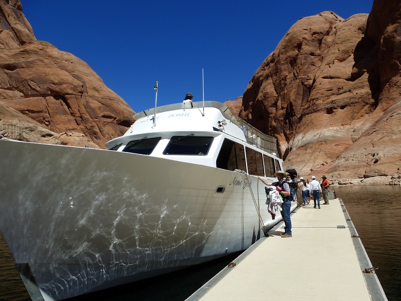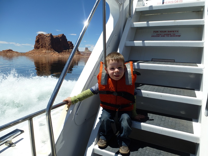 Es klappt und wir kommen früh genug aus den Federn. Bereits um 6:15 Uhr rollt unser schönes Heim in Richtung Wahweap Hafen. Dort angekommen werden die Kids angezogen und wir gehen zur Rezeption. Jeder bekommt eine gelbe Karte die uns erlaubt auf das Ausflugsschiff zu steigen. Um kurz nach 7:00 Uhr holt der Guide uns und alle anderen Mitreisenden ab. Wir kommen auf das Schiff und bekommen sogar einen Platz auf dem Oberdeck, wo wir unter freiem Himmel eine gute Rundumsicht haben.