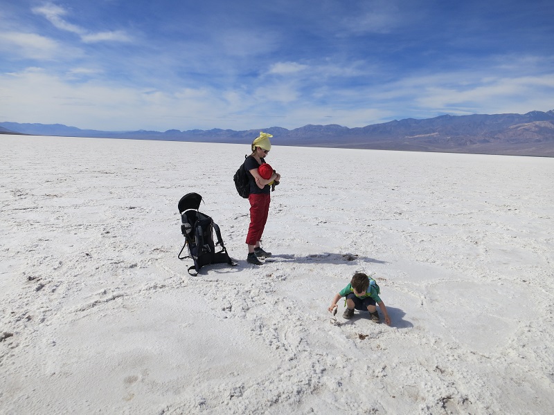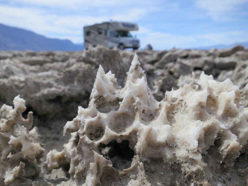 Wieder am RV angekommen fahren wir weiter zum Badwater Salzsee. Im Licht leuchtet es kilometerweit Weiß. Auf dem Boden befinden sich dicke Salzkristallschichten. Sehr faszinierend ist, wie fein sich die Salzkristalle aneinander spinnen.