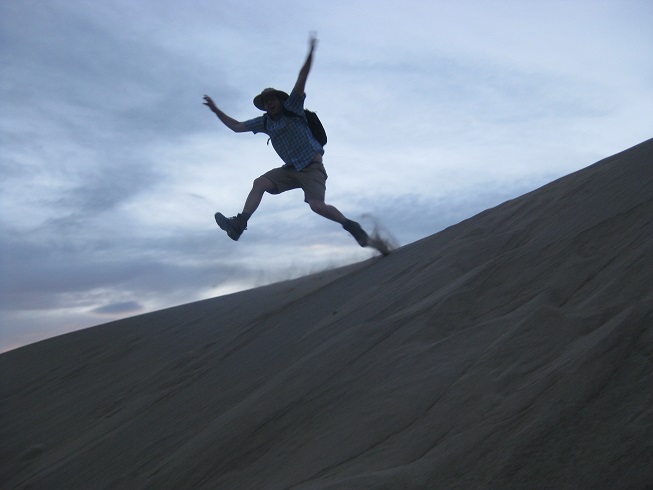 Wir wandern tief in die riesige Dünenlandschaft hinein. Die Dünen werden immer höher, so dass Jeremias sie „herunter Rutschen“ kann. Auch Papa Dominique hat seinen Spaß. Juppi!
