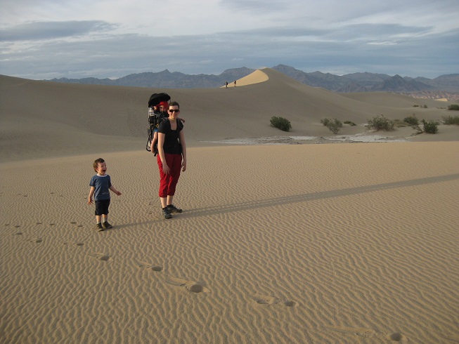 Am späten Nachmittag machen wir uns auf den Weg zu den Mesquite Falt Dunes. Nach 30 Minuten fahrt sind wir da. Die Sonne ist nicht mehr so heiß und Jeremias findet den Sand spitze.