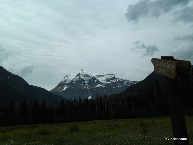 , wir betraten gleichzeitig British Columbia. Die Hwy.#16 West führt direkt zum Mt. Robson PP. Den riesigen Gletscherberg kann man wunderbar von der Terrasse des Visitor Centers beobachten, vorausgesetzt das Wetter ist gnädig und lässt auch den Blick auf die Spitze frei.