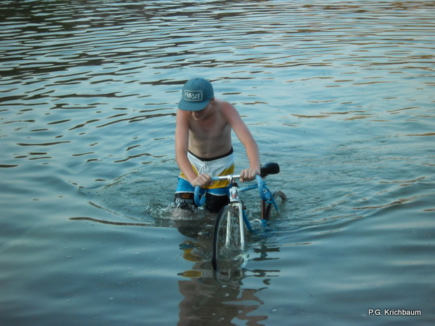 Wir konnten hier gerade eine neue Sportart beobachtenWink? "Wer kommt im Wasser mit seinem Fahrrad am weitesten"?