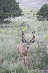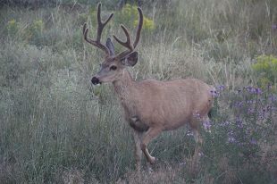 Obwohl wir heute 210 Meilen vor uns haben, lassen wir es gemütlich angehen. Wieder waren wir recht früh im Bett, deshalb werde ich früh wach. Als ich um 6Uhr aus dem Fenster schaue, wird es gerade hell, aber die Sonne ist noch nicht da. Ich höre von draußen ein Geräusch: da steht der Mule Deer von gestern Abend und sieht mir direkt in die Augen. Schnell ein Foto, dann drehe ich mich im warmen Bett noch einmal um.
