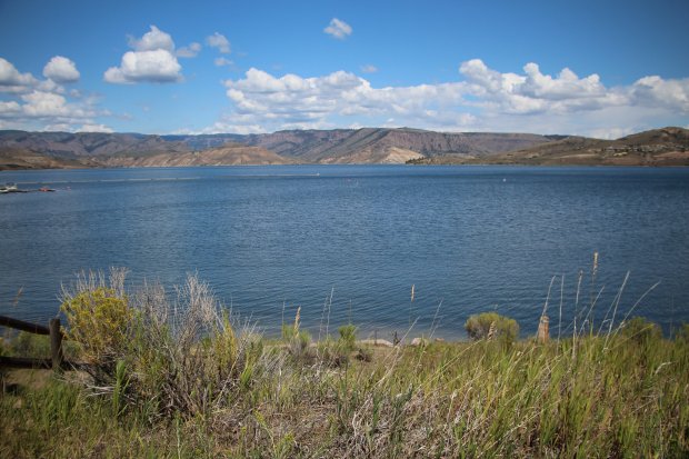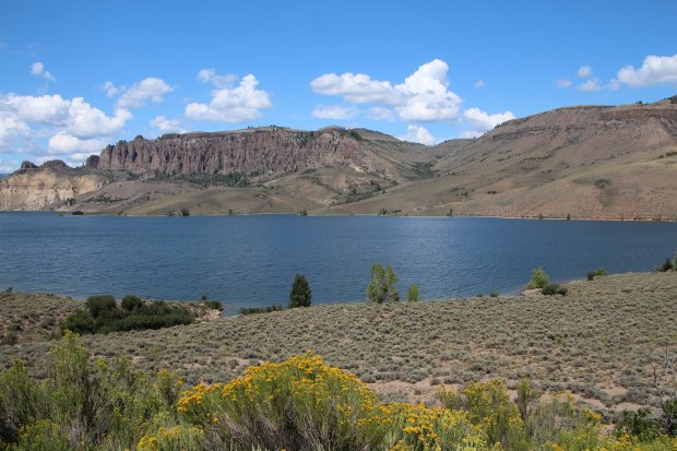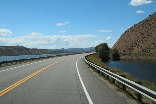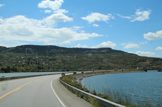 Gegen 12Uhr erreichen wir Gunnison, eine sehr aufgeräumte Studentenstadt, die auf uns einen guten Eindruck macht, halten kurz am Walmart und kehren zu Lunch und free WiFi bei McDonalds ein. Unsere Wetter-App sagt für den Nachmittag Regen voraus, also fahren wir schnell weiter, denn wir wollen baden. Mittlerweile ist es 13:30Uhr. Im Internet hatte ich versucht, eine Badestelle am Blue Mesa Reservoir der Curecanti Recreational Area zu finden. Gar nicht so einfach, überall darf man mit dem Boot an- und ablegen, auch angeln. Aber baden?? Fehlanzeige. Ja, baden denn die Amerikaner nicht?? Also schauen wir hier vor Ort nochmal genau hin. Viele, viele Bootsanleger, ja. Viele, viele Angelstellen, auch! Aber kein Badestrand weit und breit, so wunderschön der Stausee auch in der Landschaft liegt und so idyllisch sich die Küstenstraße entlangschlängelt. Campingplätze sehen wir auch, aber wieder ohne Badestelle, auch nirgendwo Sandufer, nur Steine oder Büsche.