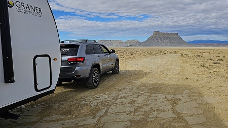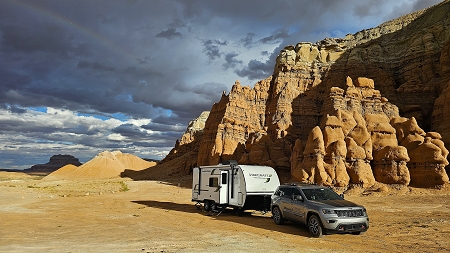 Jetzt geübt im Offroad-fahren und -campen wollen wir an der Little Wild Horse Road am Goblin Valley State Park boondocken. Meine Sorge, hier samstags keinen Platz zu finden, stellt sich als völlig unbegründet heraus. Allerdings sind wir auch noch vergleichsweise früh dran. Die boondocking-Plätze gehen von der Little Wild Horse Road ab und teilen sich in einen East-/North- und West-Campground. Als erstes erreicht man den East-CG; der Zufahrtsweg (Dirtroad) sieht sehr abenteuerlich und die Sites besetzt aus, soweit man das von der Straße aus sehen kann. Also weiter. Wir landen am West-CG und wagen es. Auch hier ist die Dirtroad ähnlich abenteuerlich wie beim Moonscape, aber natürlich viel kürzer. Trotzdem brauchen wir 20 Minuten, um an der Site 1 anzukommen. Ich laufe wieder nebenher und räume Steine aus dem Weg. Nochmal ähnlich lange dauert es, bis wir unser Gespann auf der Site platziert haben. Denn sie ist zwar riesig groß und rund, aber sehr schräg und uneben. Dafür stehen wir hier am Ende der boondocking-area und deshalb ganz alleine und ohne Durchgangsverkehr.