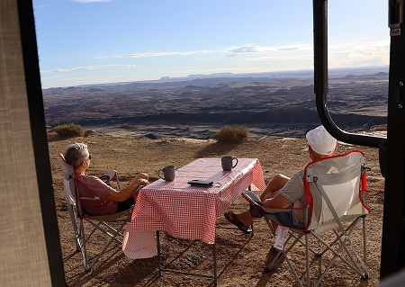 Was für ein unbeschreiblich schöner Sonnenaufgang, und schöner kann auch unser Frühstücksplatz nicht sein, für den wir heute mal den Campingtisch aufbauen. Unser Nachbar erzählt, dass er nachts ein paar Mal aufgestanden ist. Er ist aber wegen des Wetters enttäuscht über die Foto-Ausbeute. Ein Grund, nochmal wieder zu kommen, meint er.