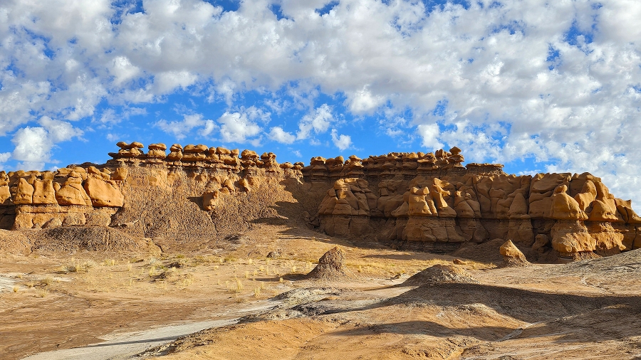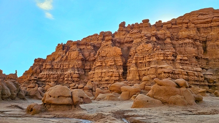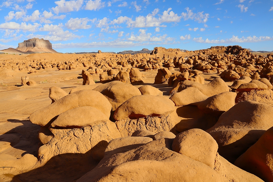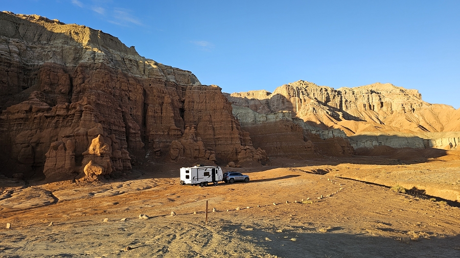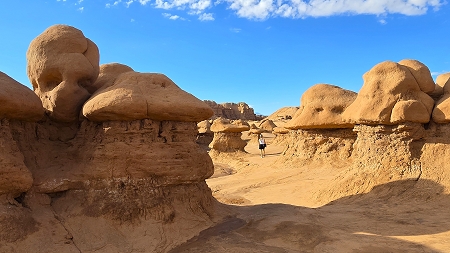 Wir fahren zum Goblin Valley, parken unser Gespann auf dem noch leeren Parkplatz und laufen los ins Tal der Kobolde. Um 8:30Uhr ist hier die Sonne gerade eben so angekommen und noch überhaupt nichts los, obwohl Sonntag ist. Ein paar leichtsinnige junge Leute klettern aber schon auf die höchsten Hoodoos und grölen durch die Gegend.