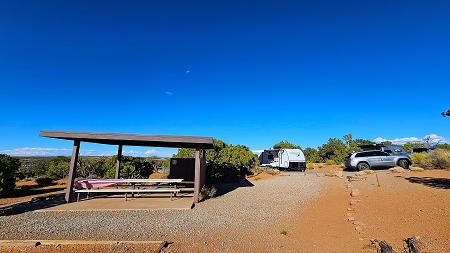 Erst aber fahren wir nach Moab, wuselig und voll ist es hier. Seit unserem ersten Besuch vor 12 Jahren haben wir den Eindruck, es wird von Mal zu Mal größer und voller. Die Stadt boomt, vom Outdoor-Trend und den Touristen in den Nationalparks. Irgendwie gelingt es uns, das Gespann auf dem engen Parkplatz des City Market einzuparken. Drinnen ist alles gut sortiert, so wie wir es in Erinnerung hatten. Herrlich frische Maiskolben finden wir, und Bison-Burger-Patties. Es ist schließlich kurz vor 15Uhr, als wir in den Dead Horse Point State Park einfahren. Ein eigentlich kurz gedachter Stopp am VC wird dann wegen WLAN doch länger als geplant. Eigentlich wollten wir nur Feuerholz und Eis für die Kühlbox kaufen, Vorbereitung für die morgige Tour. Schnell ist eine Stunde vorbei, mit der erfreulichen Nachricht von Jessica, wir können unbesorgt sein, die Motorlampe habe nichts Schlimmes zu bedeuten, es sei die Serviceleuchte für das Abgassystem und hänge oft mit Tankentlüftung zusammen; so lange sie nicht rot leuchtet, bräuchten wir uns keine Sorgen zu machen (sie ist tatsächlich auch mittlerweile wieder aus).