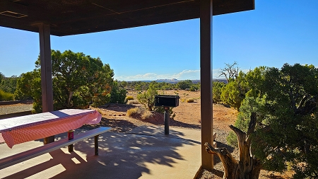 Schließlich aber landen wir auf der Site 6. Nicht die schönste aller Sites, aber eine der wenigen, die für unsere Gespann-Länge geeignet ist und für den heutigen Tag verfügbar war. Von der Tisch-Bank-Kombi kann man weit-weit sehen; sie steht aber etwas weg vom Trailer hinter einem Busch. Schwer zu leveln ist es hier.