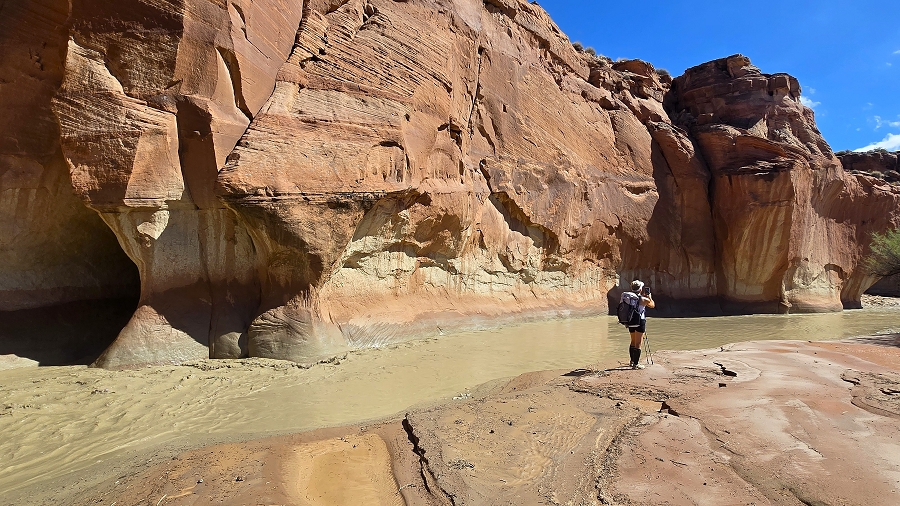 Aber bei all dem: zurück zu unserer eigenen Tagesplanung. Um es auf den Punkt zu bringen: alle unsere Optionen zerfließen mit dem Wasser, das uns überall einen Strich durch die Rechnung gemacht hat. Ein bißchen sitzen wir hier fest. Was also tun, bei diesem strahlend blauen Himmel und Sonnenschein und der guten Wettervorhersage? Nach der betretenen Stimmung gestern siegt heute die Neugier. Wir wollen uns das mal aus der Nähe anschauen und nur ein gaaaaanz klitzekleines bißchen in den Canyon laufen… natürlich nur falls ohne Risiko möglich. Also Neoprensocken an, Wasserschuhe festgezurrt und los geht´s. Das tosende Geräusch des Flusses ist heute nur noch ein mildes Rauschen, der Fluss ein blau-brauner Bach, Wasserstand deutlich gesunken, Fließgeschwindigkeit mindestens halbiert.