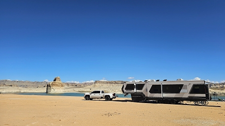 In Page tanken wir nochmal voll, danach statten wir dem Lone Rock CG einen Besuch ab. Nicht viel los hier, nur einige amerikanische Riesenwohnwagen mit einer Wagenburg und natürlich einige motorisierte Wasserfahrzeuge.