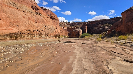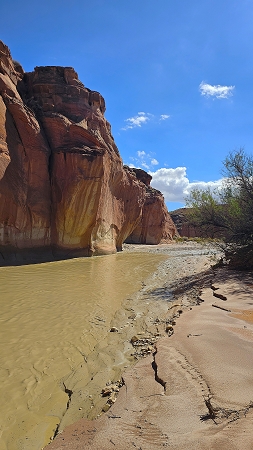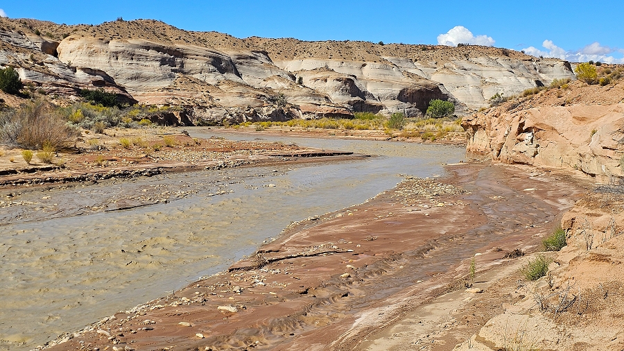 Schließlich siegt aber unsere Unternehmungslust, die Sonne lacht, und heute ist heute. Also ab Richtung Page, um dann auf die Dirtroad zu den Wahweap Hoodoos abzubiegen. Vorbei an der Fish Hatchery, und dann…. stehen wir vor einem breiten Wash, der sich – wie der Paria River gestern - in einen Fluss verwandelt hat. Der Coyote Creek ist heute eher ein Coyote River. Das Ufer ist aufgeweicht und hat sich in einen tiefen Schlamm verwandelt.