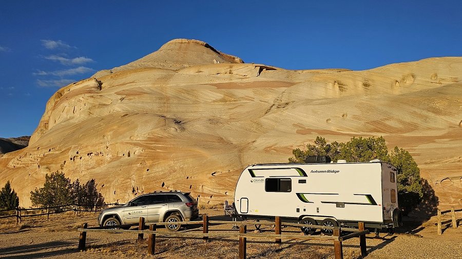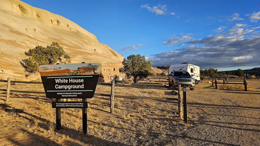 Zur Idee mit dem Alstrom Point meint er, auch dort am Beginn der Smokey Mountain Road müsse ein Wash überquert werden, er wäre nicht sicher, wie dort aktuell die Situation sei. Da es sich aber um den gleichen Fluss wie zum Trailhead der Wahweap Hoodoos handelt, sinkt unsere Hoffnung. Wir überlegen, uns das einfach mal anzuschauen, ist ja von hier nur ein Katzensprung. Abschließend gibt er uns noch einige Tipps für eine mögliche Tour zur White Pocket für morgen.