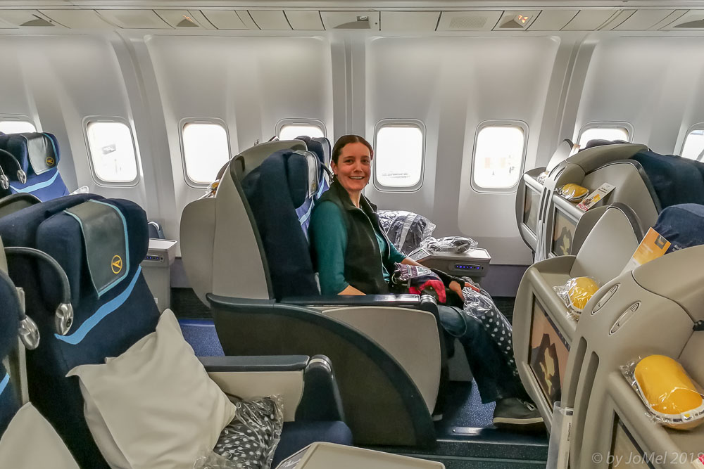 Der Flieger steht pünktlich bereit und kaum dass wir sitzen haben wir auch schon ein Glas Sekt zur Begrüßung in der Hand. Das fängt ja schon mal gut an. Und es geht nahtlos so weiter. Die Sitze sind der Hammer, noch nie sind wir so entspannt geflogen. Und das Essen ist ein Traum. Wir hatten ja gehofft das der Flug besser wird als sonst, immerhin fliegen wir diesmal Buisness aber unsere Erwartungen werden noch deutlich übertroffen.
