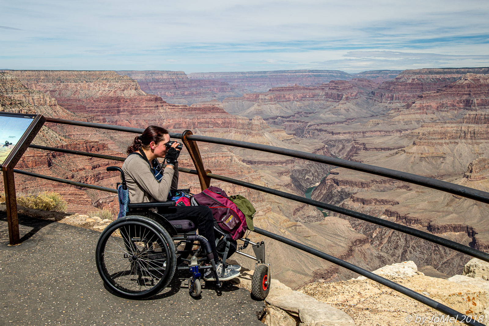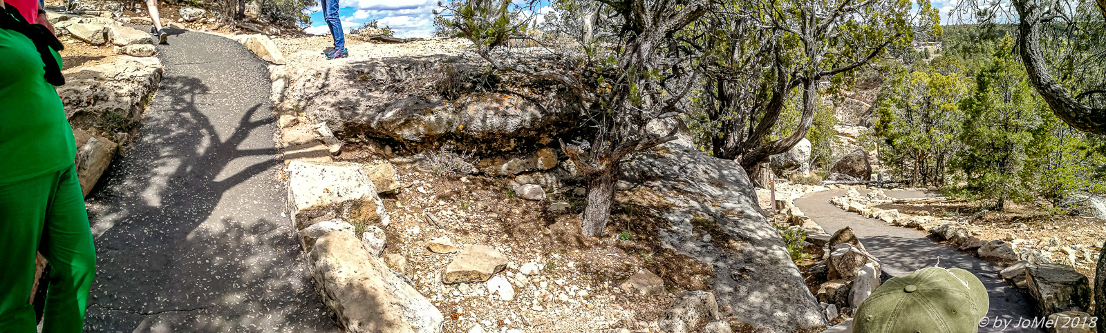 Von dort aus geht es wieder mit dem Bus zurück bis zum Mojave Point und dann wie gehabt am Rim entlang. Bis Hopi Point ist der Weg unbefestigt, danach asphaltiert wenn auch eigentlich nicht rollstuhlgerecht. Aber wann hat uns das schon mal gestört.