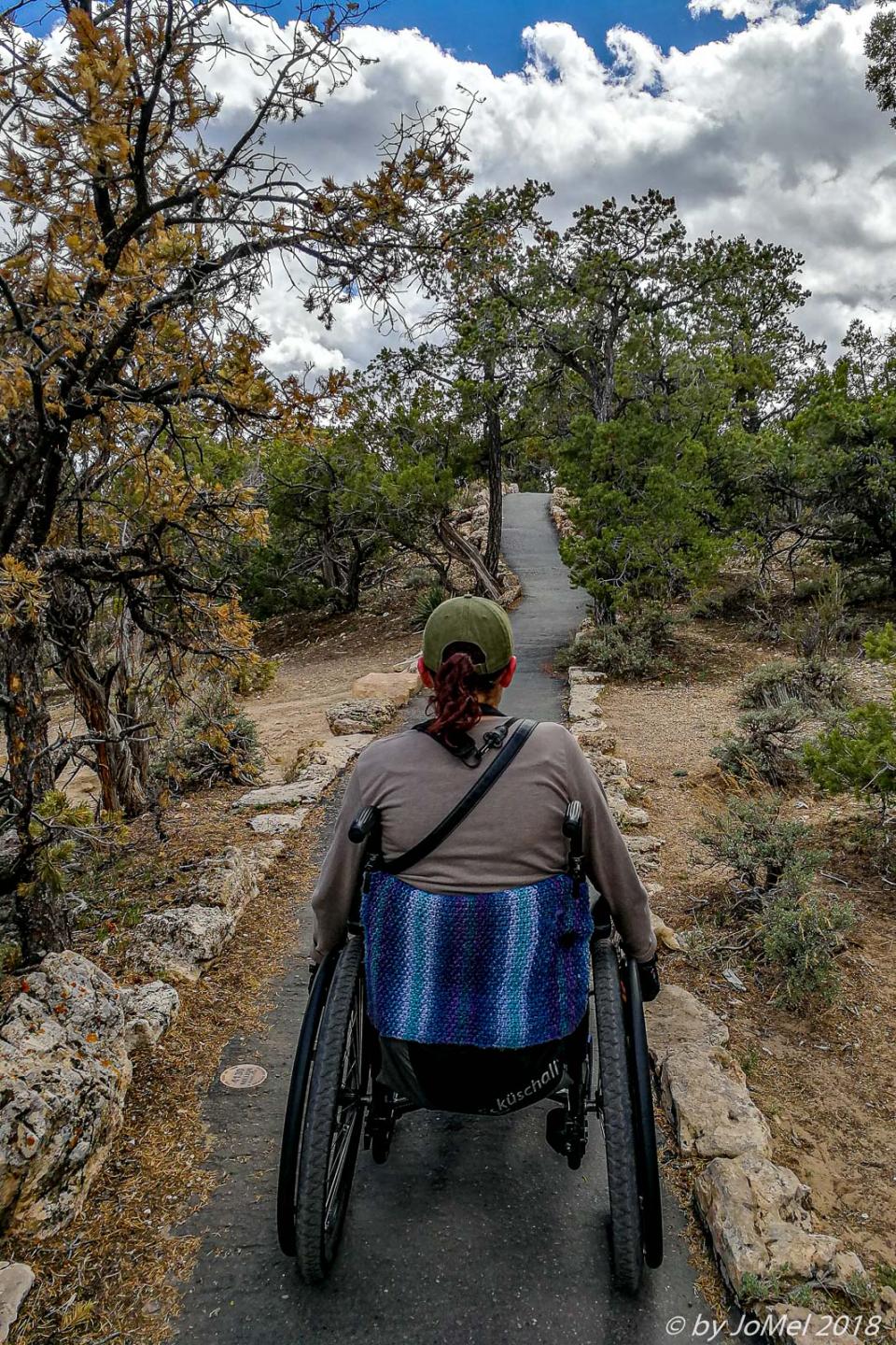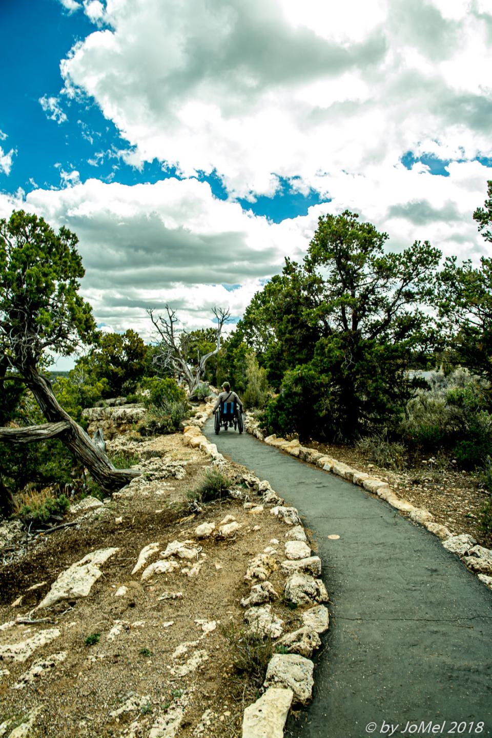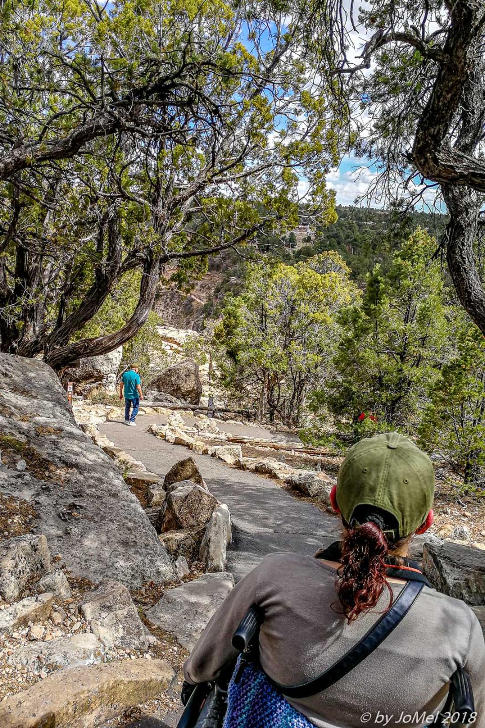 Die restlichen 3 Kilometer sind eng und wellig und eigentlich nicht mit dem Rollstuhl machbar. Vor allem das letzte Stück bis zur Haltestelle an der Bright Angel Lodge hat Stufen und ist teilweise ziemlich steil. Da haben wir uns an der Lodge dann doch glatt nochmal ein leckeres Eis verdient. Zumal wir unser Essen im Womo vergessen haben und das wiederliche Zeugs das es in Hermit`s Rest gab nicht wollten.