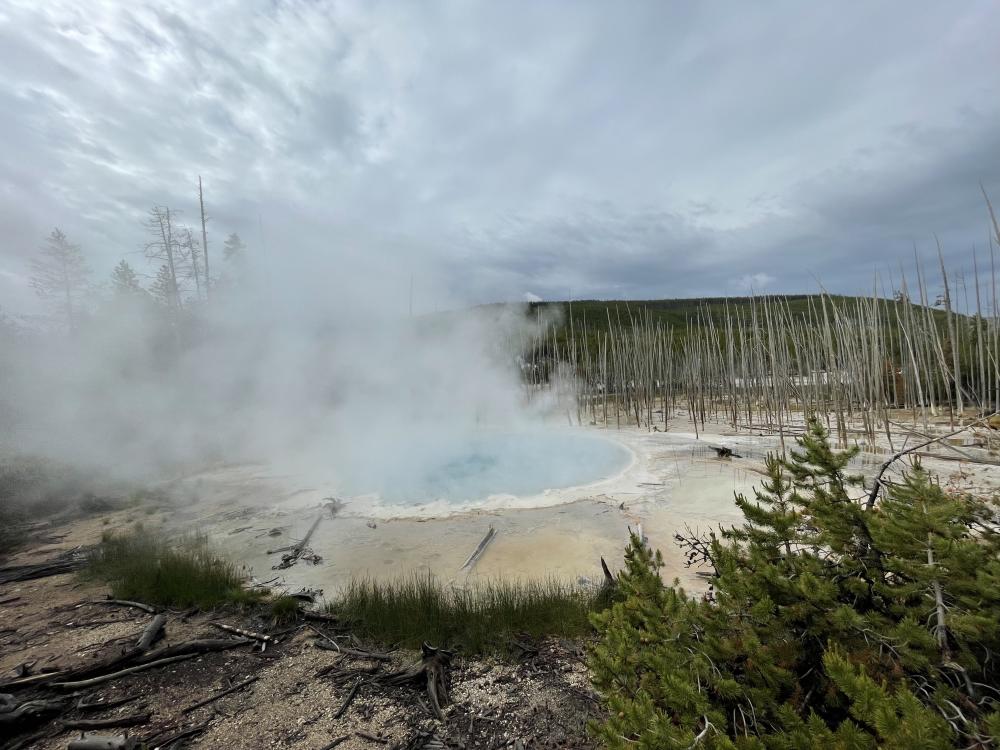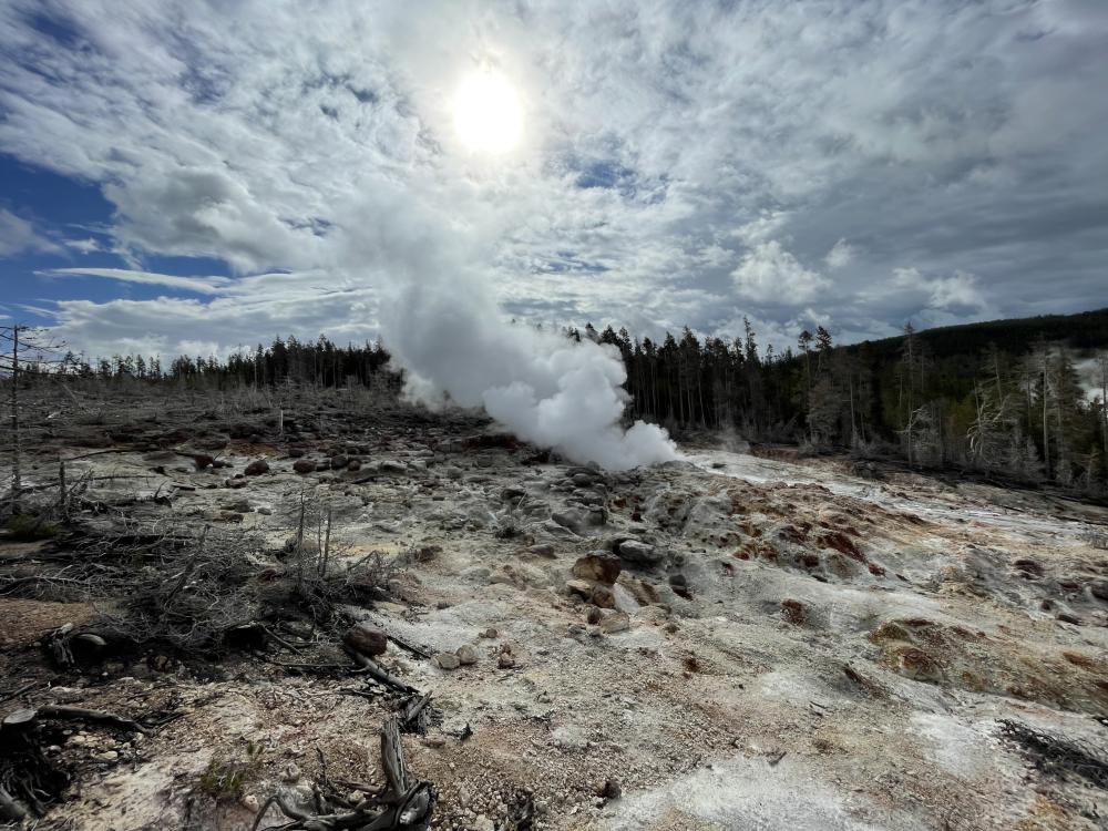 Unser heutiger Frühstücks-Spot ist das Norris Geyser Basin. Nach einer Runde über die Boardwalks lauschen wir noch einem Ranger Vortrag  und lernen auch warum die Ranger ihre Autos auf dem Parkplatz abdecken. Denn wenn dieser Steamboat Geyser ausbricht werden regelmäßig die Fahrzeuge auf dem Parkplatz verschmutzt da der Parkplatz in der vorherrschenden Windrichtung liegt. Diesen mineralischen Sprühnebel wieder vom Auto zu bekommen ist sicherlich wenig spaßig.