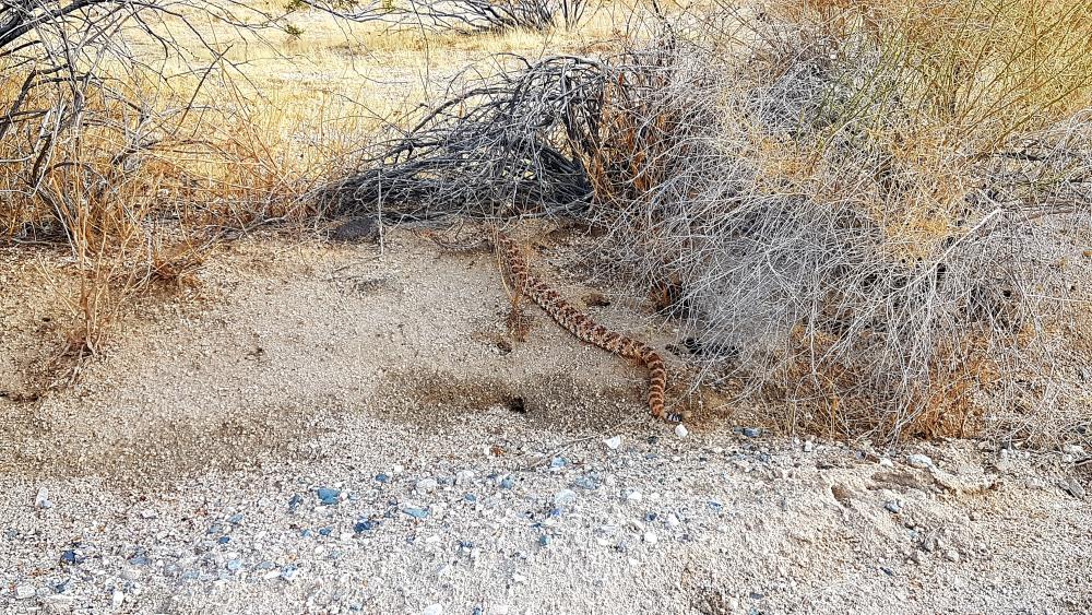 Das Thermometer steigt, gefühlt ist es jedoch nicht viel heißer als in LA. Wir drehen eine erste Runde in unserem Loop, immer hübsch bedacht auf etwaige Tierchen zwischen den Grasbüscheln. Als ich auf dem Rückweg zum Wohnmobil die Graslandschaft verlasse und auf den Schotterweg trete, zischt es plötzlich vor mir! Snake Surprise! Sie funkelt mich an! Ich mache erst einmal einen Satz nach hinten, sie folgt mir. Mmmhhh... sehr beruhigend