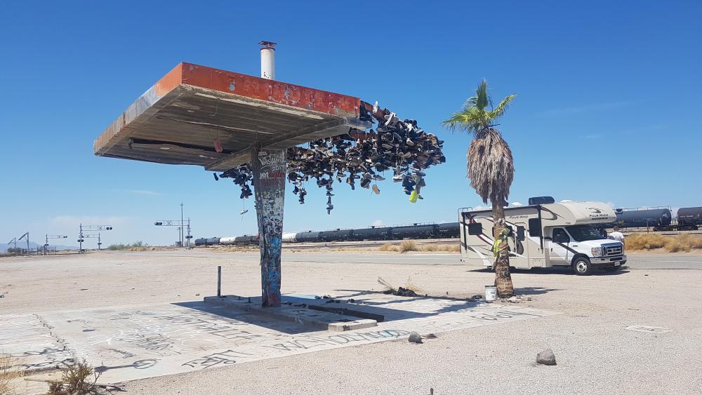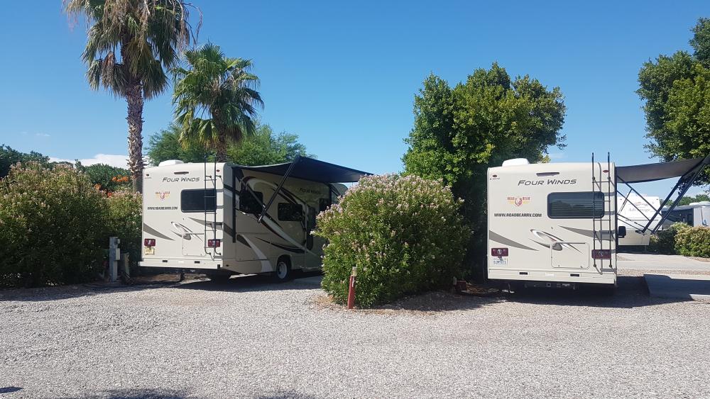42 Grad in Verbindung mit heißem Wind - diese Kombi hatten wir auch noch nicht. Wir checken ein und tauschen gleich noch ein paar Dollar in Quarter. Bettwäsche und Handtücher können eine Wäsche vertragen. Unsere beiden Sites A001 und A002 sind prima! Die Sanitäranlagen auch! Wir schließen unsere Womos am Strom an und schalten die Klima auf volles Ballett. Den Rest des Tages verbringen wir am Pool mit kühlen Getränken. So lässt es sich aushalten