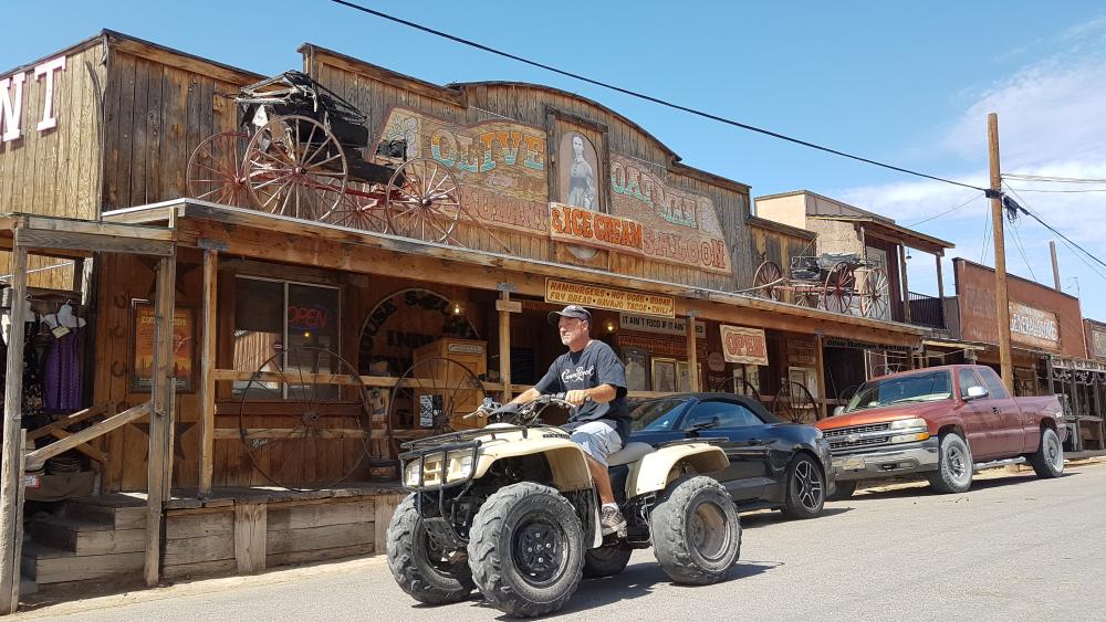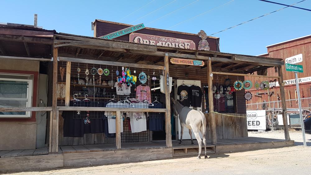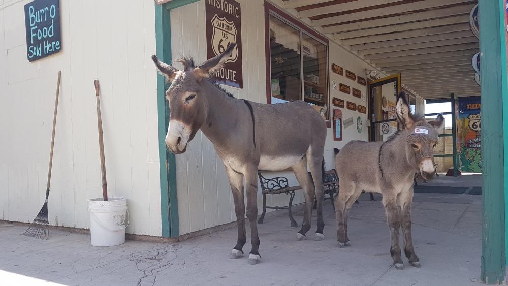 Wir parken unsere Bären auf einem Schotterparkplatz und machen uns zu Fuß an die Erkundung. Oatman ist ziemlich gut besucht, trotz der unglaublichen Hitze. Ich finde es toll dort. Eine richtig urige Westernstadt mit überniedlichen Eseln. Am Ortsausgang warten wir Mädels im Schatten, die Männer holen die Wohnmobile, sammeln uns ein und es geht weiter Richtung Hackberry. Auch diese Strecke zieht sich nochmal ganz schön.