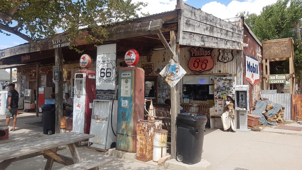 Das ist doch mal eine prima Sache! Freudestrahlend betanken wir unser Schiff und nehmen uns noch zwei Arizona Icetea mit auf die Fahrt. Unsere Kolonne setzt sich in Bewegung und nimmt Kurs auf Oatman.
