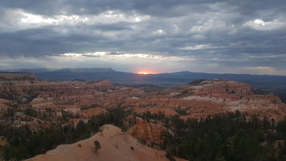 Wir positionieren uns am Sunrise Point und genießen die morgendliche Atmosphäre am Rim. Leider wollen sich die Wolken einfach nicht verziehen, sodass uns der hoch gelobte Sonnenaufgangsanblick am Bryce verborgen bleibt Wir erhaschen nur einen kurzen Blick auf den orangefarbenen Ball...