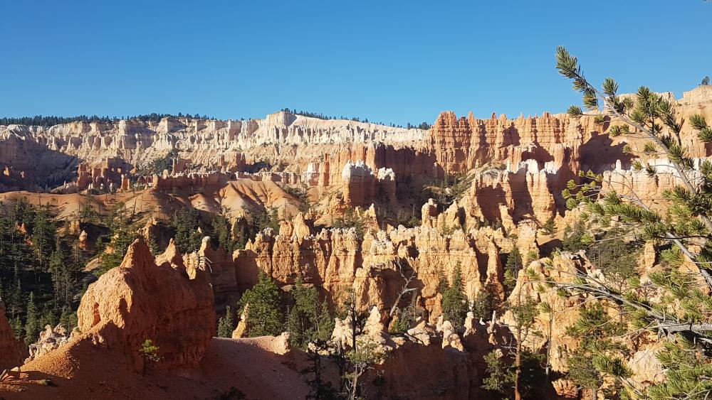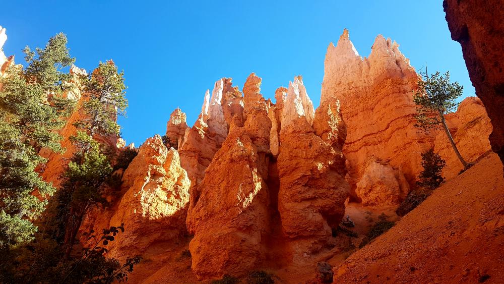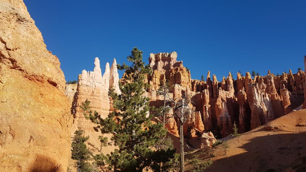 Wir laufen zurück zum Wohnmobil, gönnen uns ein kräftiges Frühstück, um anschließend zur geplanten Wanderung in den Bryce Canyon aufzubrechen. Mein Mann verzichtet, so ziehen wir zu Dritt los Ich habe für uns den Queens Garden Trail/ Navajo Trail rausgesucht. Die ersten Meter in den Canyon hinunter sind herrlich. Es ist etwas ganz Anderes, die Hoodoos von unten zu sehen. Die Sonne scheint mittlerweile und lässt die Gesteinsformationen in den tollsten Farben leuchten.