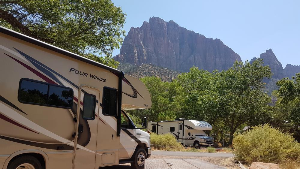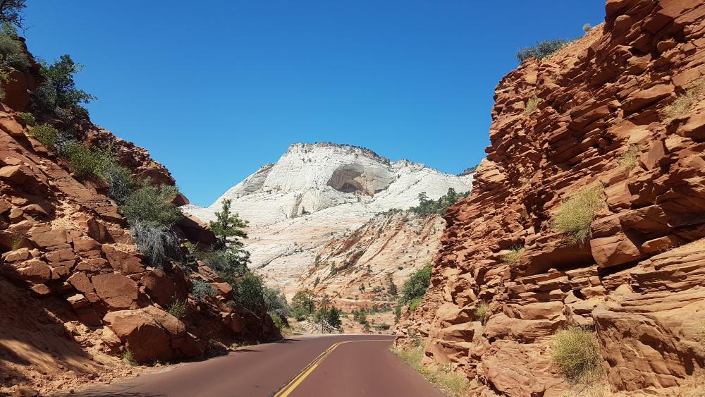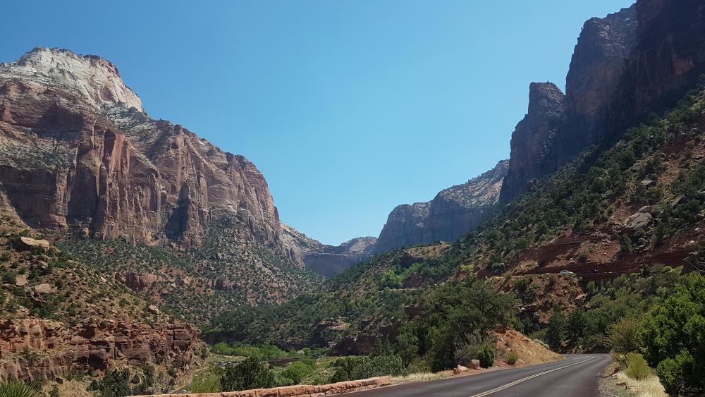 Die kurze Strecke bringen wir in knapp 2 Stunden hinter uns. Am Parkeingang knöpft uns der nette Ranger noch 15 $ für die Durchfahrt des Zion Mount Carmel Tunnels ab und wir dürfen "eintreten". Die ersten Meter im Nationalpark rauben uns schon den Atem. Es ist einfach nur wunderwunderschön! Geplant war eigentlich, auf dem Weg zum Campground einen Abstecher zum Canyon Overlook zu unternehmen. Leider bekommen wir mit zwei Wohnmobilen dort keinen Parkplatz. Den Mount Carmel Tunnel durchfahren wir als erstes Fahrzeug in der Autoschlange - ein weiteres, ganz persönliches Highlight für uns! Ich bin total aufgeregt und freue mich immer mehr auf den Park!
