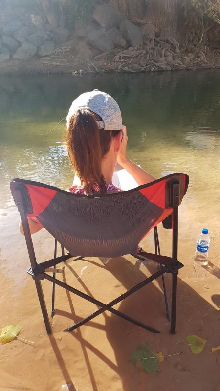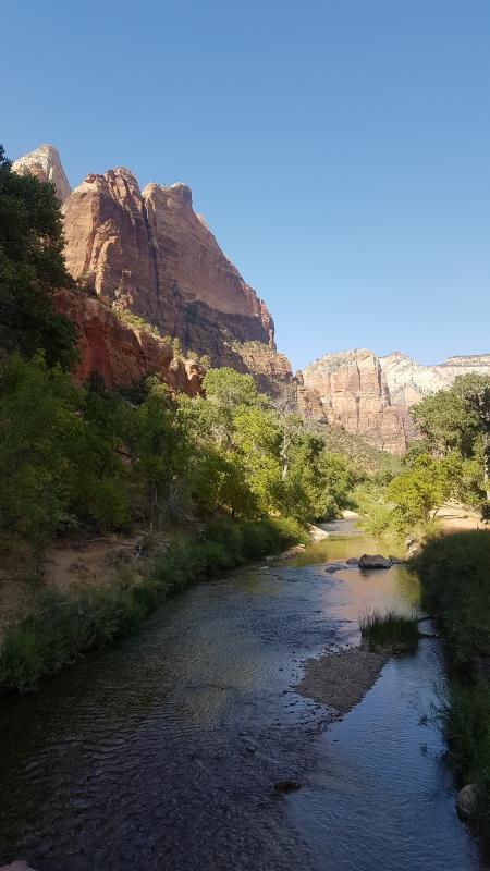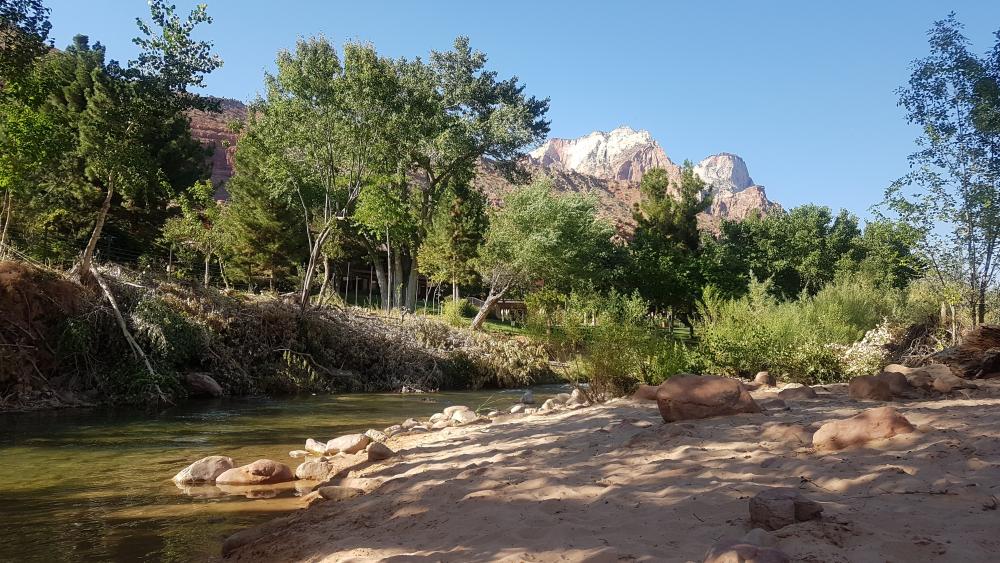 Tatsächlich waren 2 von 3 Trails, die ich mir für unseren Parkbesuch vorgenommen hatte, gesperrt. Der Observation Point und der Hidden Canyon fallen also aus - sehr schade! Es bliebe der Angels Landing... wir beschließen, die Entscheidung zu verschieben und machen uns auf Wunsch unserer Mitreisenden erst einmal auf den Weg zu den Lower Emerald Pools... Wenig verwunderlich zu dieser Jahreszeit, erwartet uns ein Rinnsal. Der Weg dorthin war jedoch ein guter Einstieg und nicht zu anstrengend bei den doch recht hohen Temperaturen. Wir verbringen den Nachmittag am Virgin River bei kühlen Getränken - hier bin ich! Hier bleibe ich! ![]()