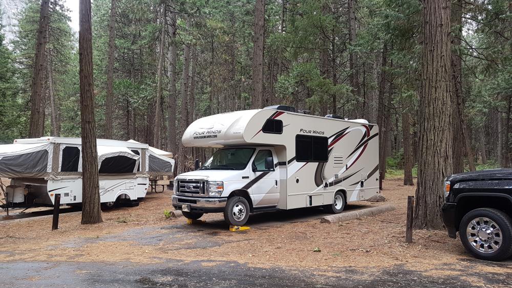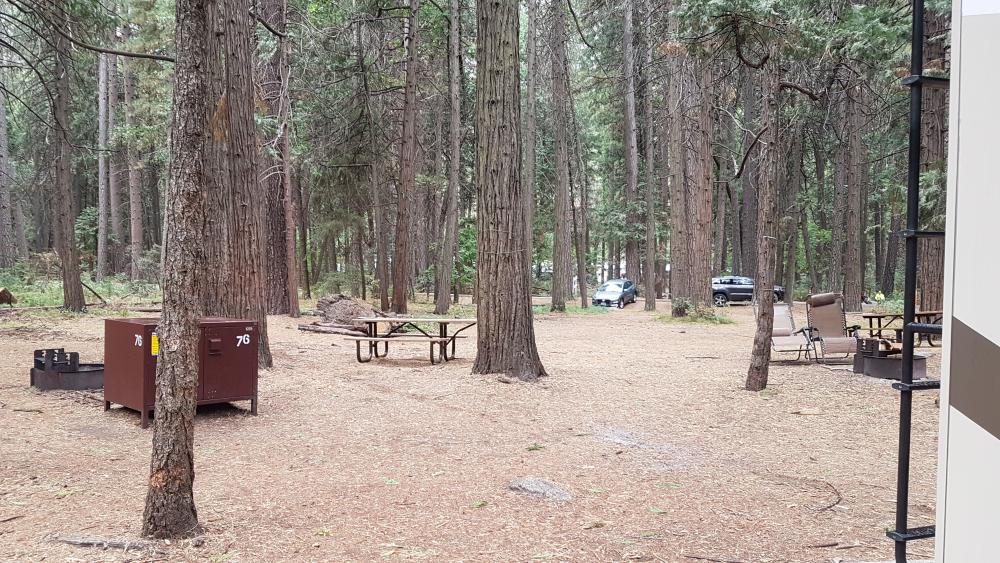 Kurze Zeit später fahren wir im Yosemite Valley ein - eine ganz andere Welt als noch vor einer Stunde. Himmel und Menschen unterwegs, vollgestopfte Straßen. Wir sind froh, nur ein kleines Wohnmobil zu fahren und bahnen uns den Weg Richtung Upper Pines CG. Schon klar, dass der Park stets sehr gut besucht ist, aber das ist der Grand Canyon auch und dort herrschte nicht solch ein Chaos laugh Am Eingang zum CG warnt man uns vor einem aktuell herumstreifenden Bären - huih! Vielleicht bekommen wir doch noch Einen zu Gesicht wink Wir beziehen unsere Site 076. Sie liegt außen im Loop, sodass wir hinter unserem Womo nur noch den Wald und später die Straße haben. Der Stellplatz an sich ist, wie alle anderen auch, nicht besonders großzügig, die Nachbarn stehen recht nah. Unsere Tisch-Bank Kombi liegt eigentlich sehr schön, leider ist sie total demoliert. Wir sind insgesamt so semibegeistert. Nun ja... Als wir zum VC wollen, fängt es ordentlich an zu gießen. Also erstmal Mittag essen und eine Stunde Pause.