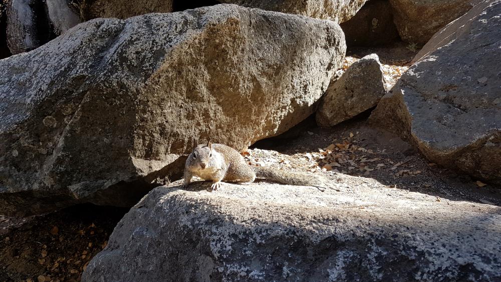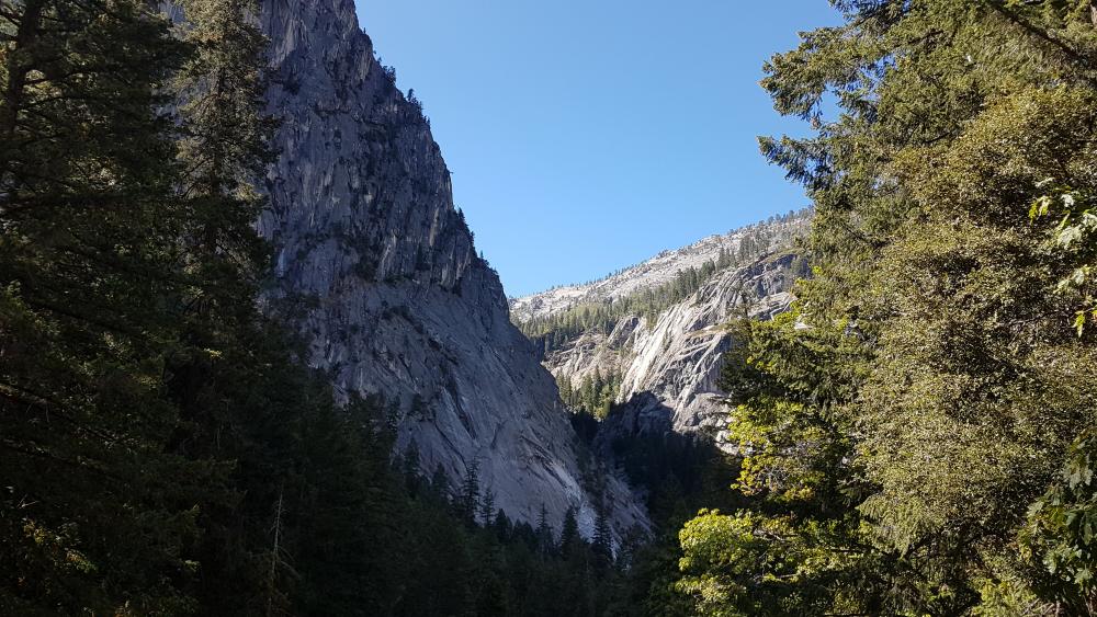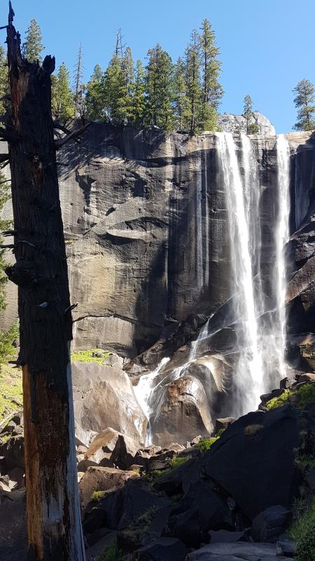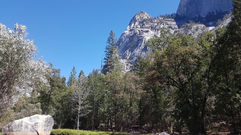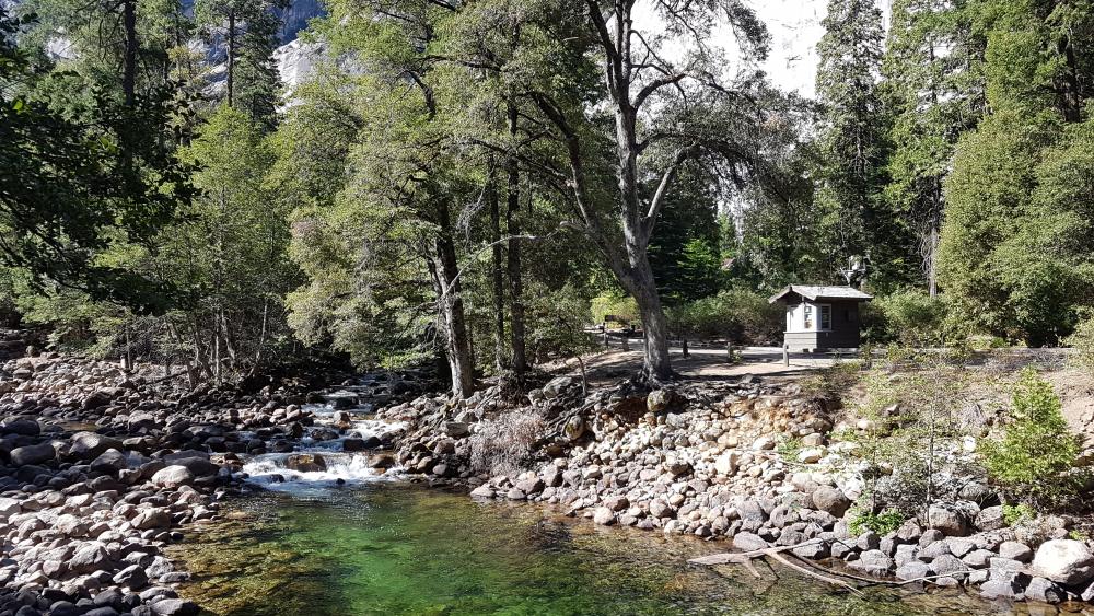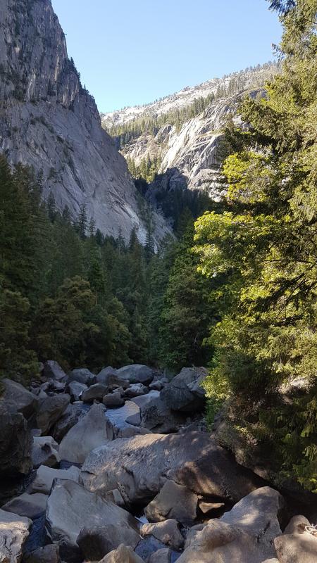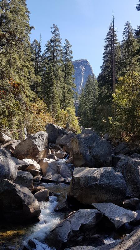 Nach einer weiteren kühlen Nacht lassen wir uns heute Morgen richtig schön Zeit. Kurz vor 11 starten wir Richtung Vernal Falls. Auf dem Weg zum Shuttle zeigt sich der Yosemite in der Sonne von seiner schönen Seite. Das Wasser des Merced River ist eiskalt, trotzdem beobachten wir einige "Verrückte", die baden gehen Ein Hirsch begleitet uns zur Shuttle Haltestelle, welch angenehme Gesellschaft.