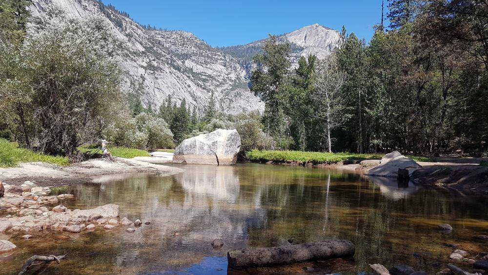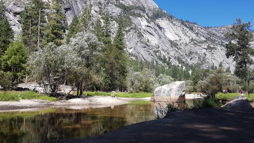 Der Rückweg ist nicht weniger anstrengend, das steile Abwärtsgehen sind wir Städter nicht gewohnt Als wir wieder im Tal sind, machen wir uns direkt auf den Weg zum Mirror Lake. Der Weg ist wesentlich weniger frequentiert und sehr einfach zu gehen. Leider fasst der Mirror Lake kaum Wasser. Die Kulisse ist aber trotzdem sehr schön! Was für ein Panorama