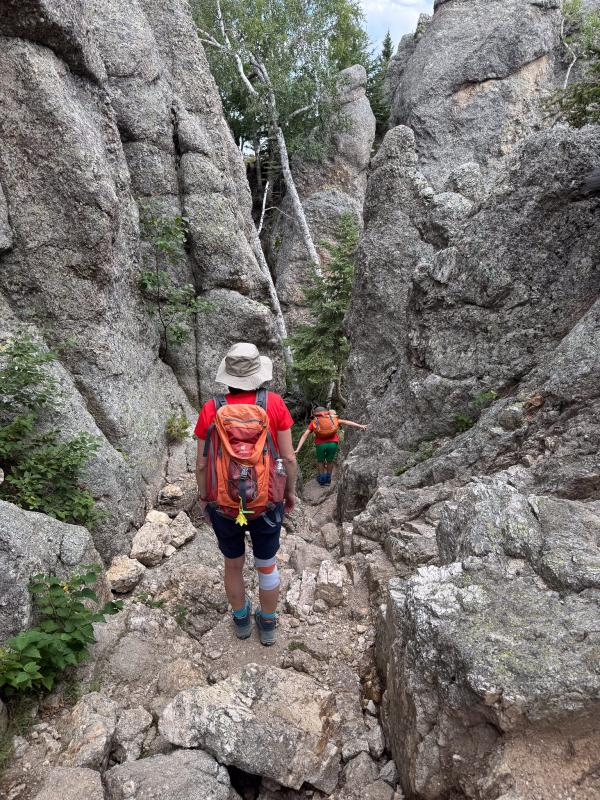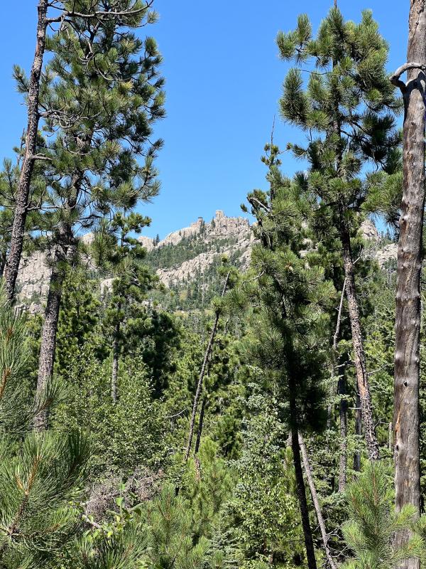 Im ersten Stück des Abstiegs treffen wir Leute, die den Trail mit Pferden hochreiten, echte Cowboys. An der ersten Kreuzung biegen wir zu den Cathedral Spires und Little Devils Tower ab. Der Trail und die Landschaft sind herrlich! Immer wieder hat man tolle Ausblicke, geht durch intensiv duftenden Wald oder direkt an Felsen entlang.