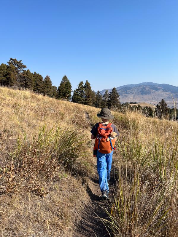 Oben verläuft er mit leichtem Auf und Ab mal durch Wiesen, hohen Sagebrush oder Wald. Wir schauen uns regelmäßig um, können aber weder Bären noch sonstige Tiere erspähen. Der Junior hat großen Respekt, vor allem wenn er nicht über die Büsche sehen kann, legt er ein ziemliches Tempo vor.