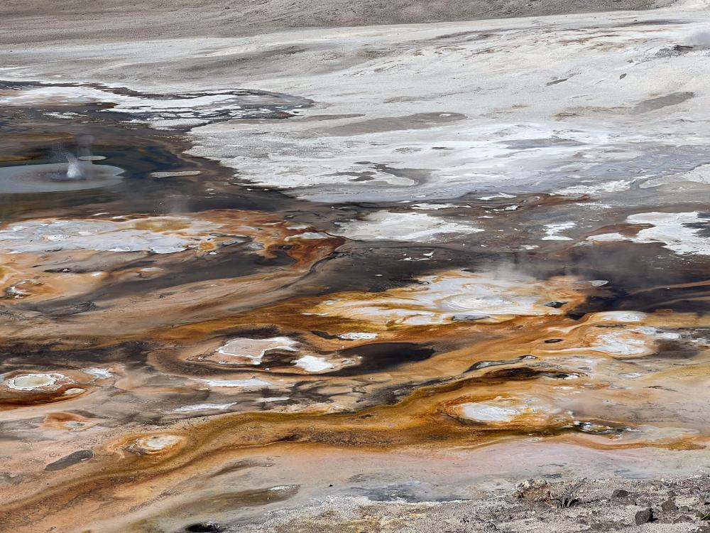 Die Pools und Springs und deren Abläufe sind alle bunt und sehr unterschiedlich. Es gibt unglaublich viel zu gucken. Am Steamboat Geyser möchte der Junior am Liebsten auf den nächsten richtigen Ausbruch warten. Der letzte war aber im April. Und so viel Proviant haben wir nicht dabei…
