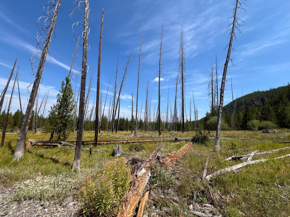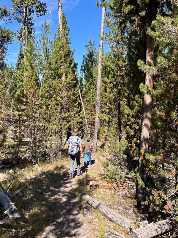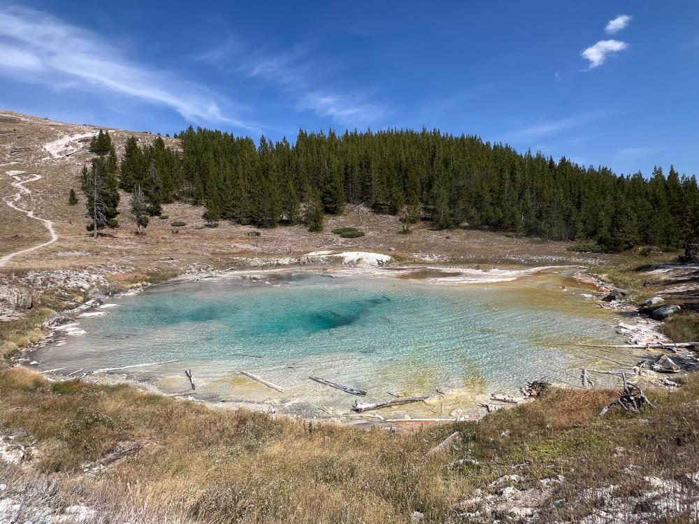 Gegen halb zehn starten wir wieder und fahren los. Am Fluss können wir noch ein paar Deers erblicken. In Madison stoppen wir zum Dumpen, bevor wir Richtung Midway Geyser Basin fahren. Wir wollen zum Overlook der Grand Prismatic Spring. Wie erwartet gibt es hier keinen Parkplatz, deshalb fahren wir etwa eine halbe Meile weiter zum Mallard Creek Trailhead. Der war uns gestern Abend aufgefallen. Es steht nur ein Auto auf dem Parkplatz. Wir packen alles zusammen und marschieren los. Ein teilweise schnurgerader Pfad führt über einen Hügel zurück zum Fairy Falls Trailhead. Außer uns ist niemand unterwegs.