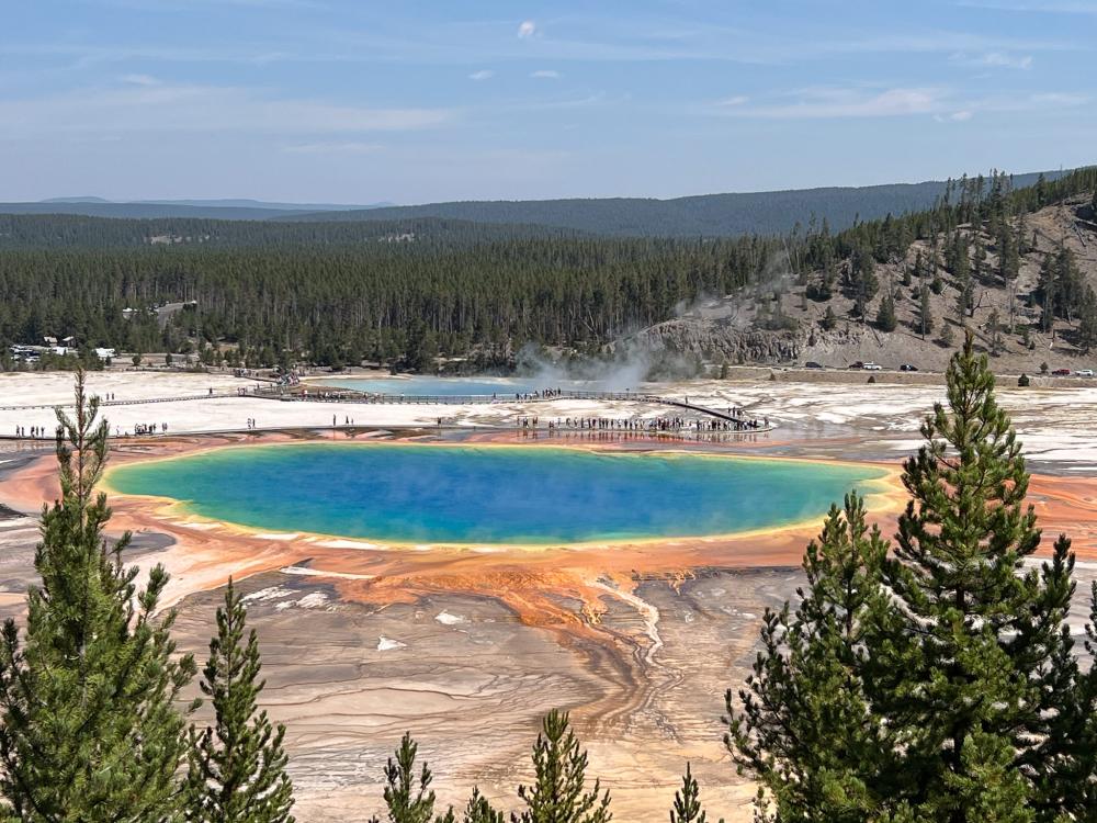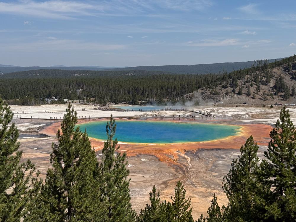 Das ändert sich auf der anderen Straßenseite. Ab dem Parkplatz gleicht der breite, geschotterte Weg einer Völkerwanderung. Aber der Overlook ist es wert, irgendwie kann man die Dimension der Grand Prismatic Spring erst von oben erfassen. Auch wenn die Aussicht nicht komplett frei ist. Vor 15 Jahren sind wir querfeldein einen Hügel hoch geklettert, da war die Sicht besser. Der Junior ist total ergriffen, endlich diesen Anblick vom Foto im Wohnzimmer live zu erleben.