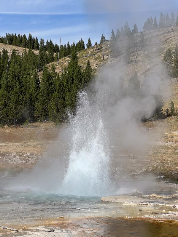 Das Imperial Geyser ist schon sehr schön, es spuckt regelmäßig unterschiedlich hohe Fontänen. Und wir haben es ganz für uns alleine. Auch auf dem Weg zum Wasserfall zurück spähen wir aufmerksam umher und unterhalten uns. Es lässt sich aber kein Bär blicken.
