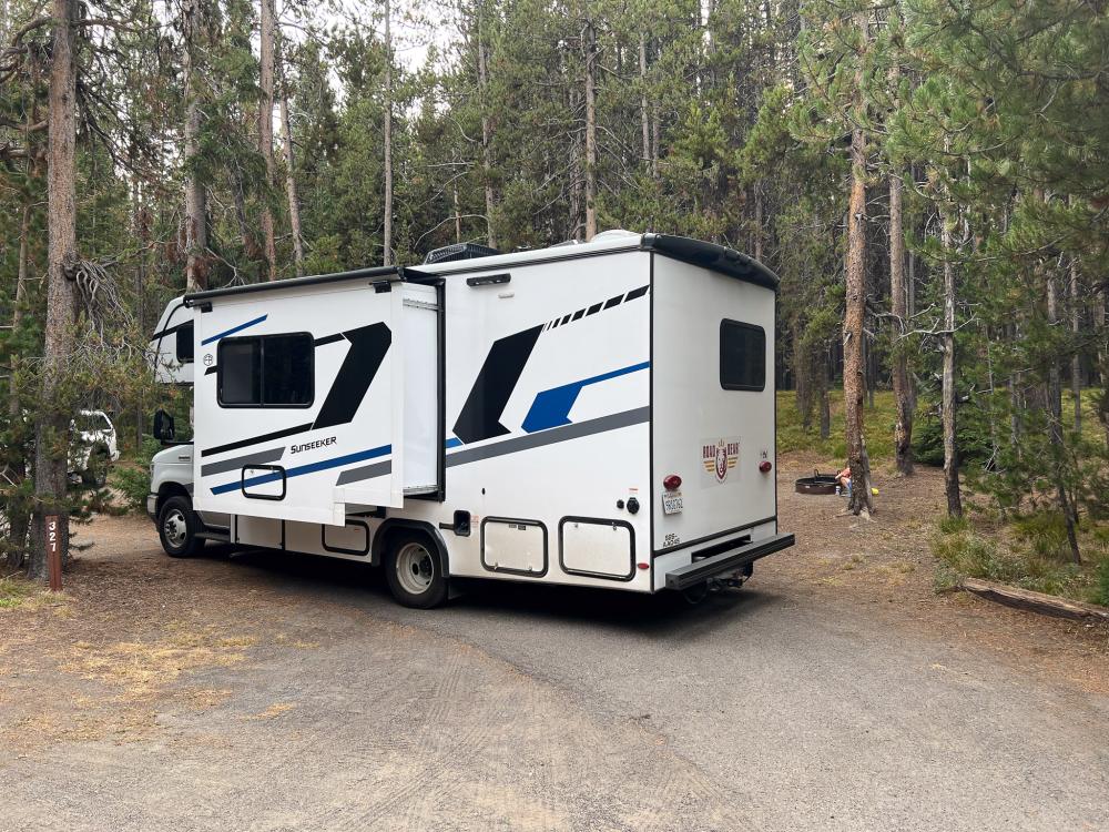 Nach 14 Kilometern bei strahlendem Sonnenschein sind wir wieder zurück beim WoMo. Nach einer kleinen Erfrischung fahren wir zum Grant Village. Hier bekommen wir Site I237 zugewiesen. Die liegt ganz am Ende des Campgrounds und ist ein recht enger Pull Thru, aber sonst großzügig. Aber mit wenig Sichtschutz zum Nachbarn.