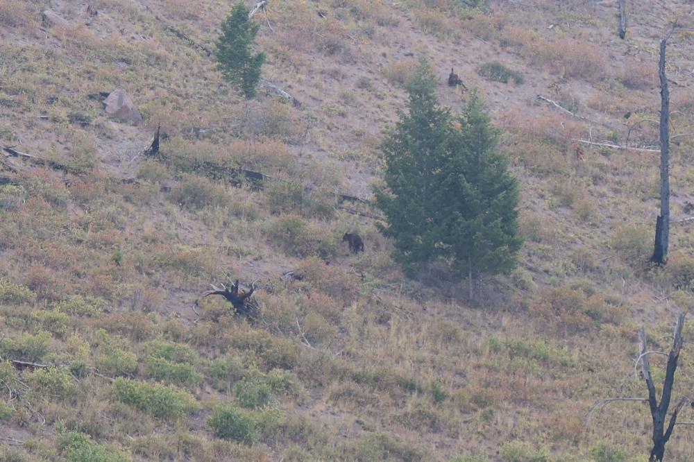 Direkt an einem Parkplatz ist ein Stau. Ein Bär. Auf dem Parkplatz ist noch jede Menge Platz, also schnell in der ersten Reihe geparkt und die Ferngläser raus. Wir können den zimtfarbenen Schwarzbären oben am Hang eine ganze Weile beobachten. Er streift gemütlich durch die Büsche und frisst Beeren. Wir frühstücken irgendwann auch, immer wieder einen Blick auf den Bären werfend. Für gute Fotos ohne Teleobjektiv ist er weit weg und kommt auch leider nicht näher zur Straße. Kluger Bär…